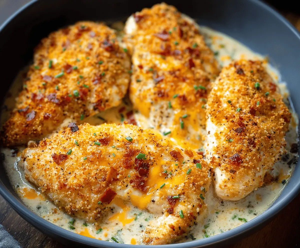Bake uncovered for about 25-30 minutes, or until the chicken is fully cooked through (internal temperature should reach 165°F or 74°C). The breadcrumb topping should be golden and crispy.