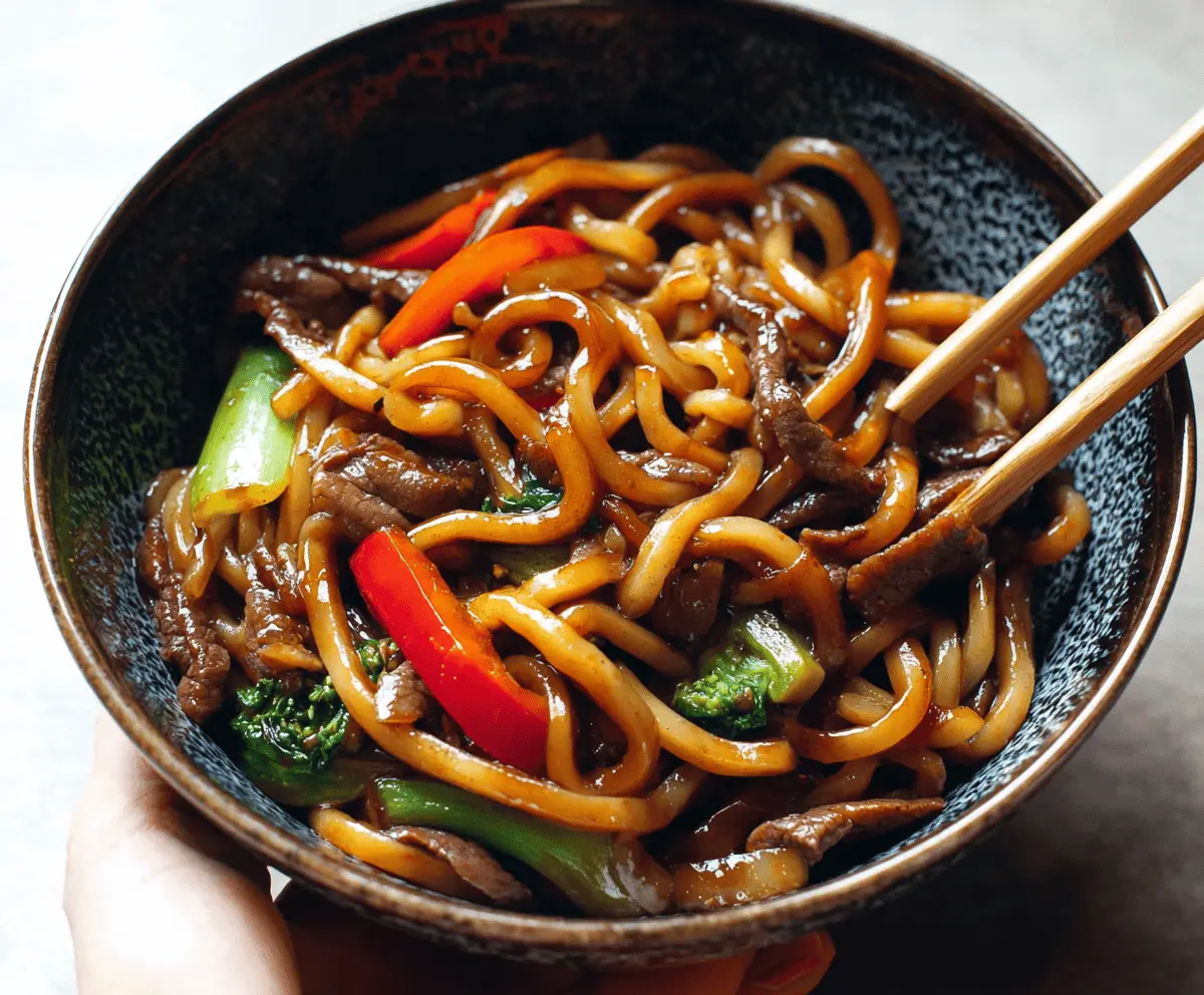 Return the beef to the pan. Add soy sauce, oyster sauce, dark soy sauce, sugar, freshly cracked black pepper, and beef broth or water. Mix well. Toss in the udon noodles, stirring gently to coat everything with the sauce. If you want a thicker sauce, stir in the cornstarch mixture and cook for another minute until it thickens.
