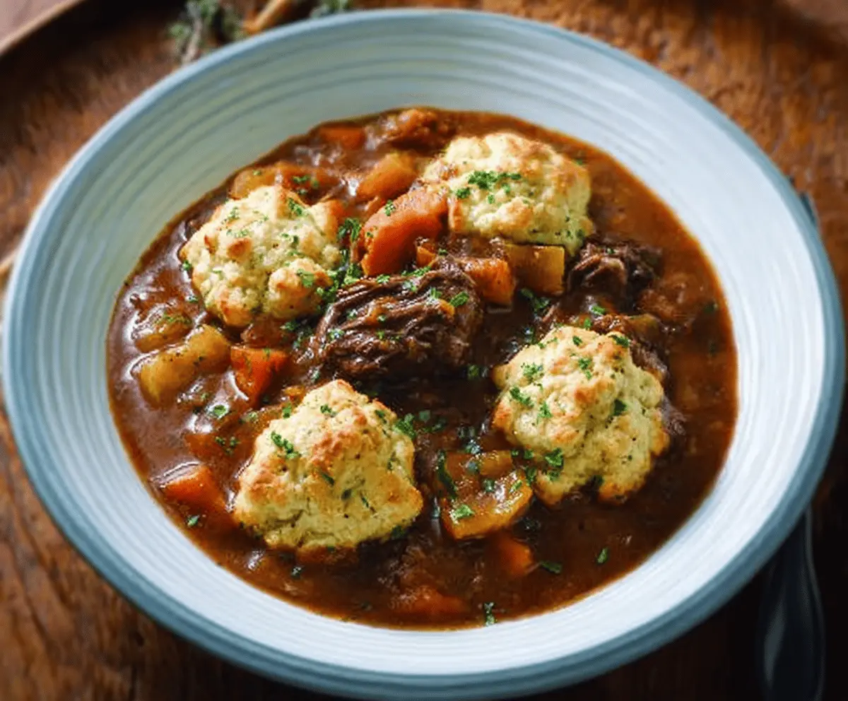 Beef Stew with Dumplings is a classic comfort meal that feels like a warm hug on a chilly day. Tender chunks of beef simmer slowly with carrots, potatoes, and onions in a rich, hearty broth, while fluffy dumplings cook right on top, soaking up all those delicious flavors. The combination is simple but incredibly satisfying.