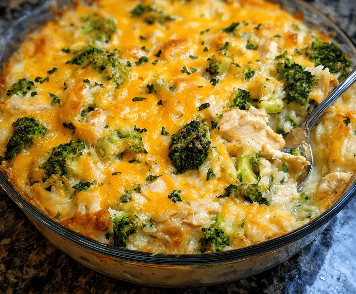 Delicious Chicken Broccoli Rice Casserole topped with melted cheese, perfect for a comforting family dinner.