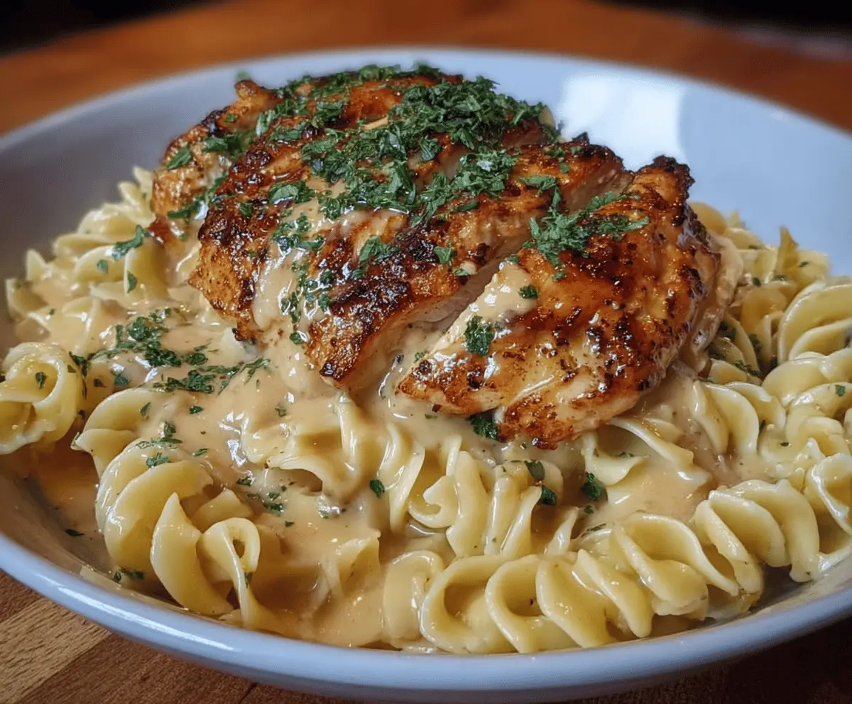 Place the buttery, creamy noodles on a serving plate, and top with the browned chicken. Sprinkle fresh chopped parsley on top for a burst of color and freshness. Serve immediately and enjoy your cozy, delicious meal!
