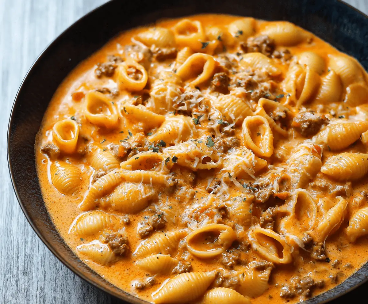 Creamy beef and pasta shells in a savory sauce served in a white bowl, garnished with fresh herbs for a delicious comfort meal.