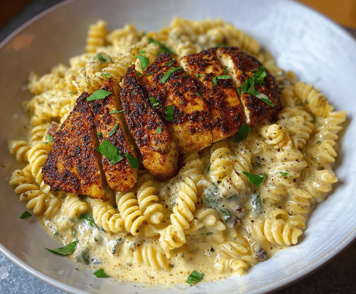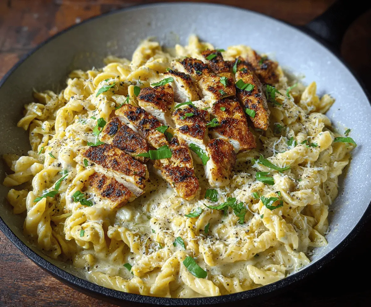 Add the cooked pasta to the skillet and toss it in the creamy sauce until well coated. Serve the pasta on plates and top each with sliced chicken. Garnish with fresh parsley and black pepper for a finishing touch.