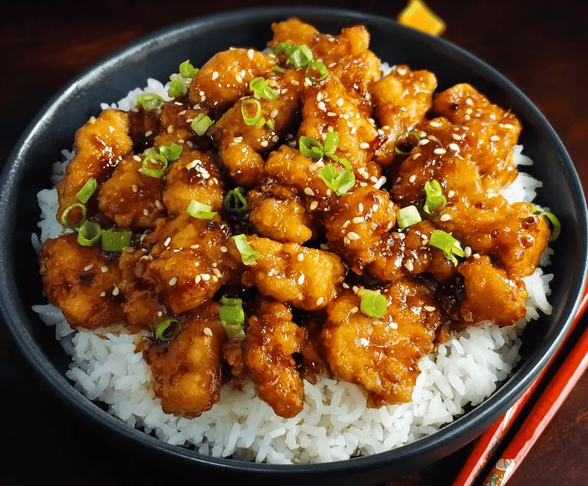 Serve the orange chicken over steamed white rice. Garnish with green onions, toasted sesame seeds, and orange slices for a fresh finish.