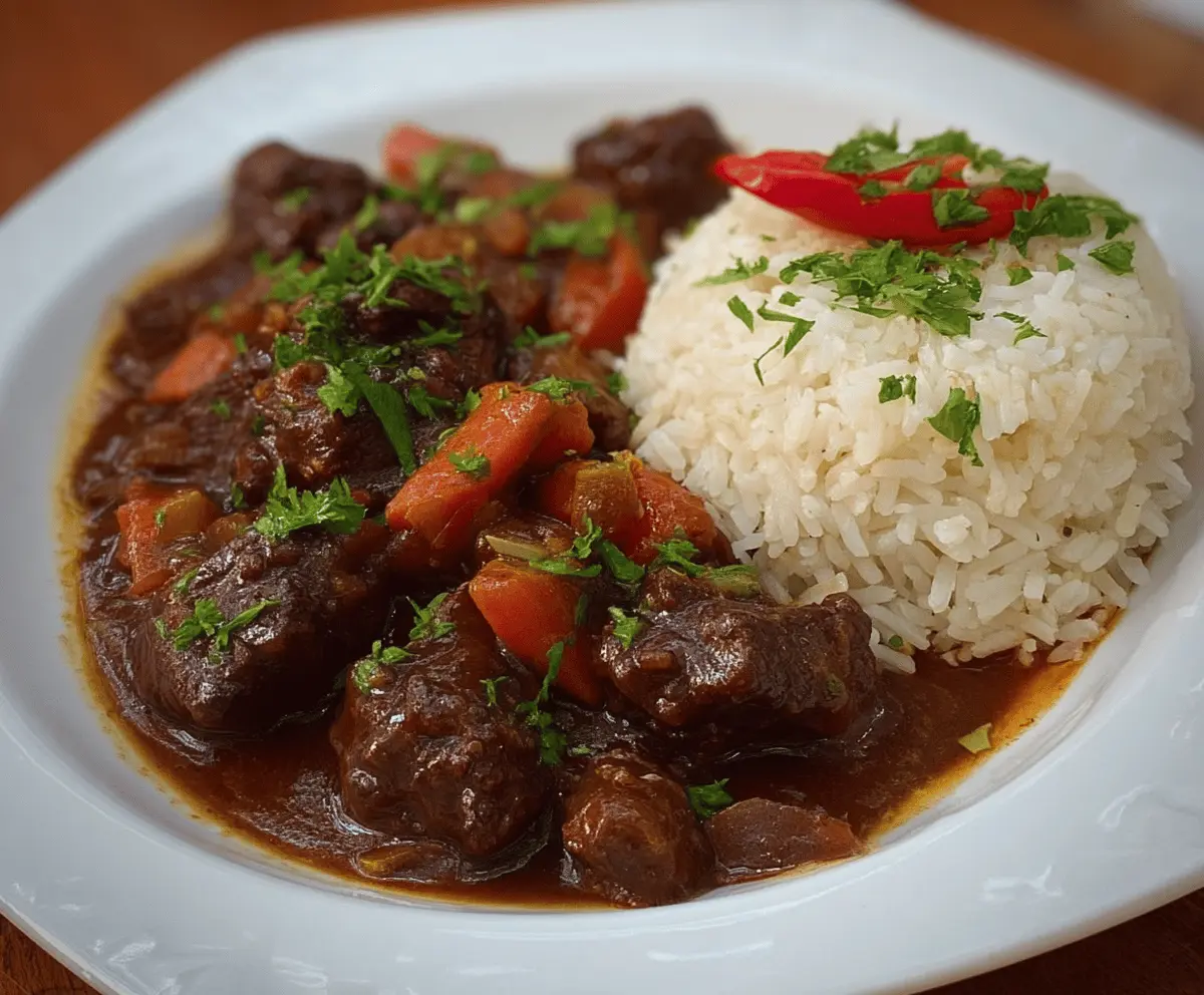 Jamaican Beef Stew with Rice is a hearty, flavorful dish that brings together tender chunks of beef, rich spices, and a thick, comforting sauce. The stew is packed with the warm taste of allspice, garlic, onions, and a hint of sweetness, simmered slowly to create that perfect melt-in-your-mouth texture. Served over fluffy white rice, it’s a filling meal that feels like a warm hug on a plate.
