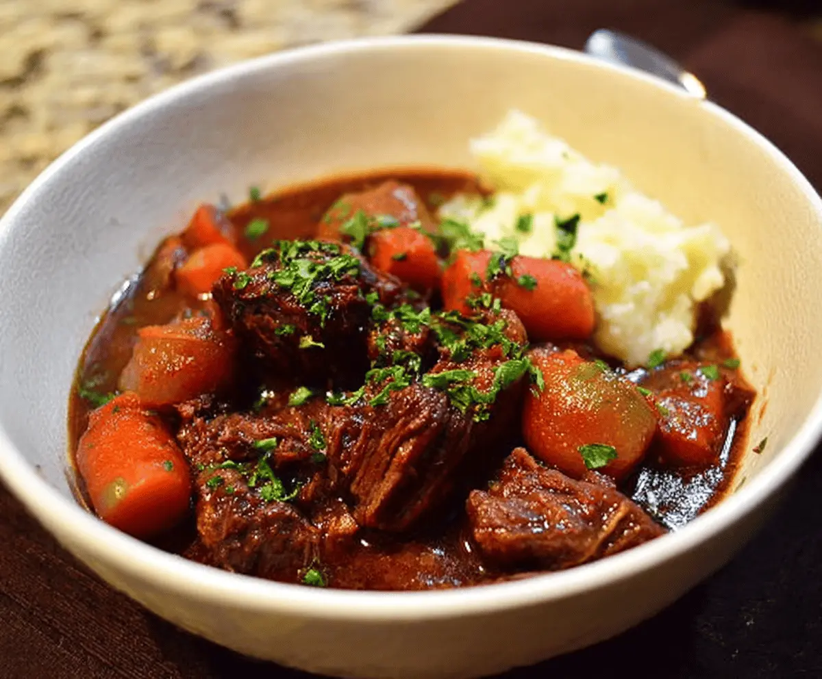 Ladle the stew into bowls and serve it alongside buttery mashed potatoes or crusty bread to soak up all the delicious sauce. Enjoy your warm, hearty meal!