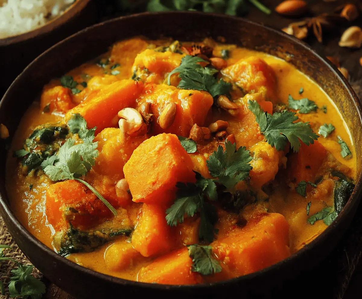 Delicious homemade pumpkin curry served with rice, featuring vibrant orange pumpkin chunks and aromatic spices, perfect for a cozy meal.