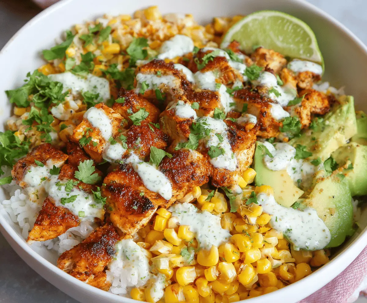 Delicious Street Corn Chicken Rice Bowl featuring grilled chicken, roasted corn, fresh herbs, and flavorful toppings on a vibrant plate