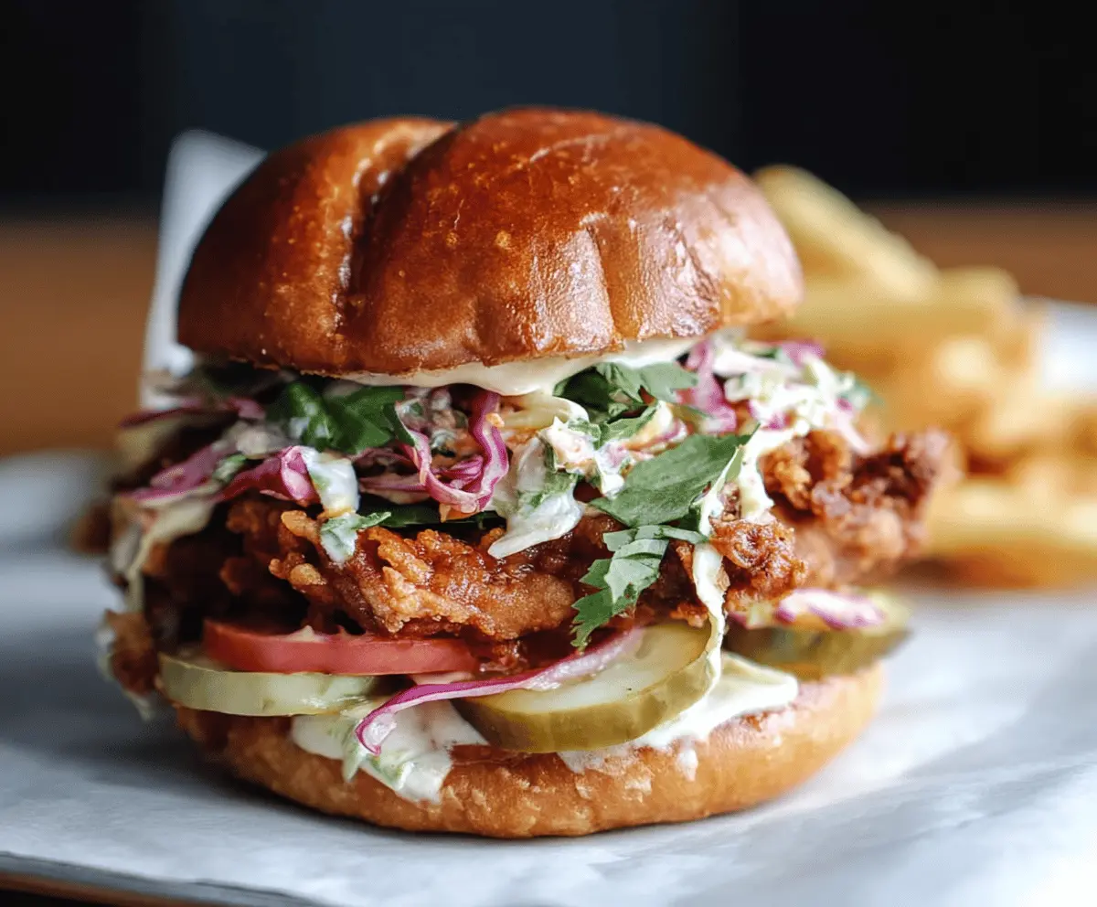 Store fried chicken and toppings separately in airtight containers in the refrigerator for up to 2 days. Reheat the chicken in the oven or air fryer to keep it crispy before assembling the sandwich.