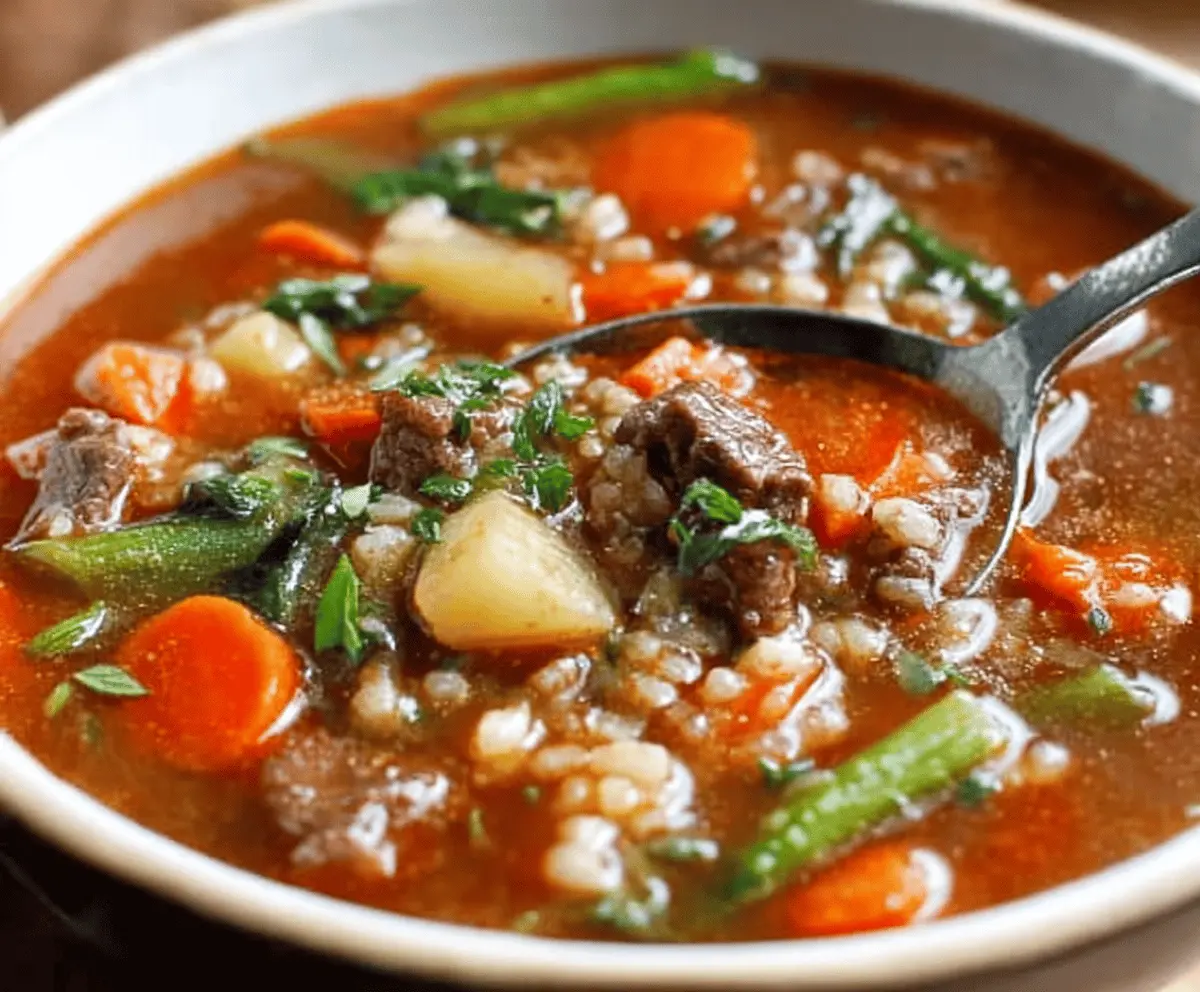 Hearty vegetable beef soup with tender beef chunks, fresh vegetables, and flavorful broth in a rustic bowl.